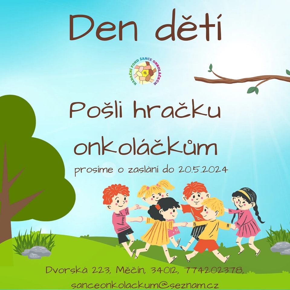 naše MŠ by ráda podpořila projekt Nadační fond Šance, který zajišťuje drobné dárky (nové a ne plyšáky!) pro onkoláčky (od miminka až po dorost) ke Dni dětí. Kdo by měl zájem se zúčastnit, noste prosím dárky k nám do MŠ, nejpozději do 17.5.2024.